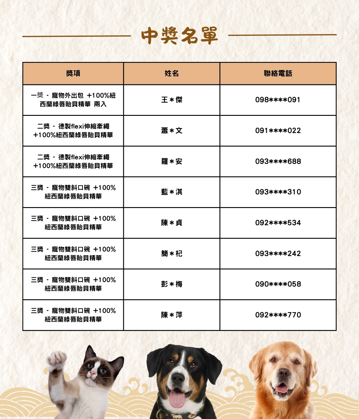 特獎 - 1名 寵物外出太空包 + Green Paw 100%紐西蘭綠唇貽貝精華 - 兩入 (價值 3,159) 二獎 - 2名 德國製 flexi 飛萊希 伸縮牽繩 + Green Paw 100%紐西蘭綠唇貽貝精華 (價值 1,570) 三獎 - 5名 寵物雙斜口碗 + Green Paw 100%紐西蘭綠唇貽貝精華 (價值 1,479)—中獎名單—